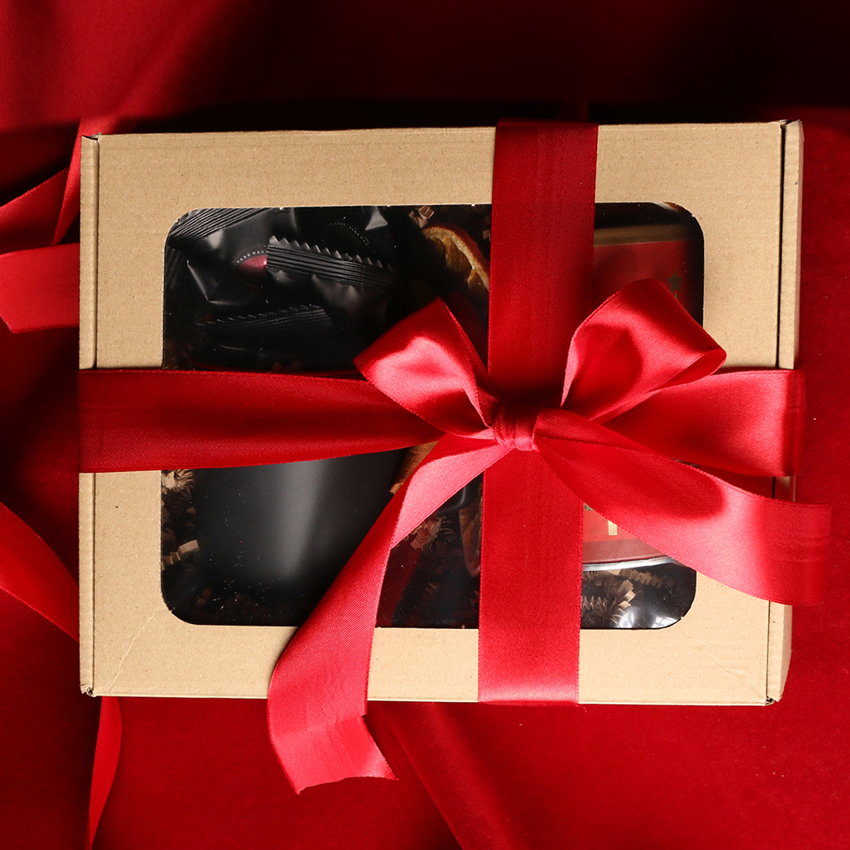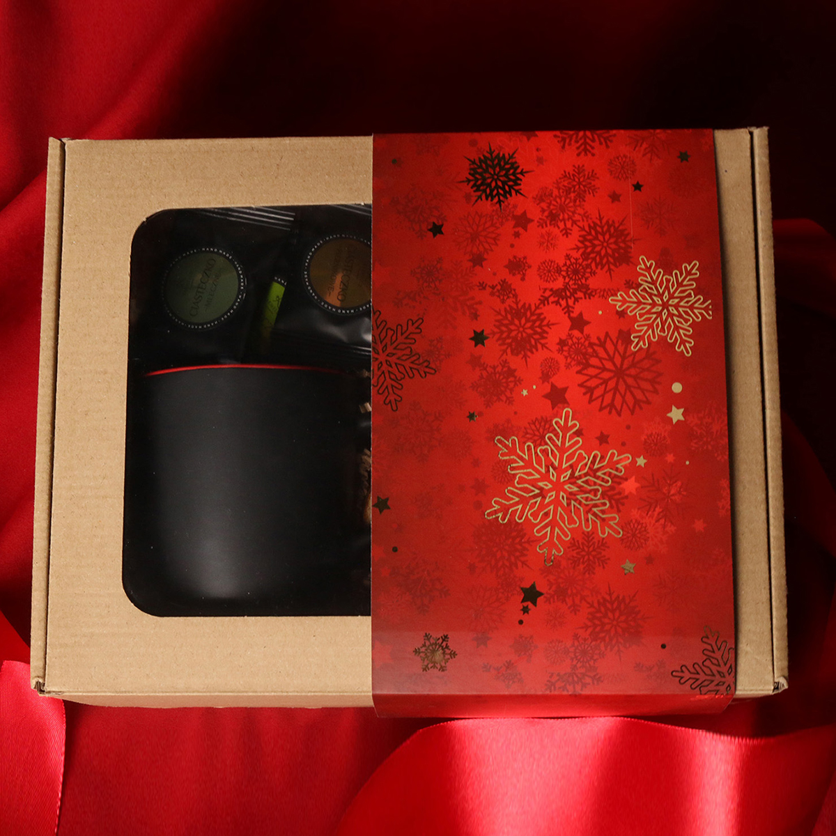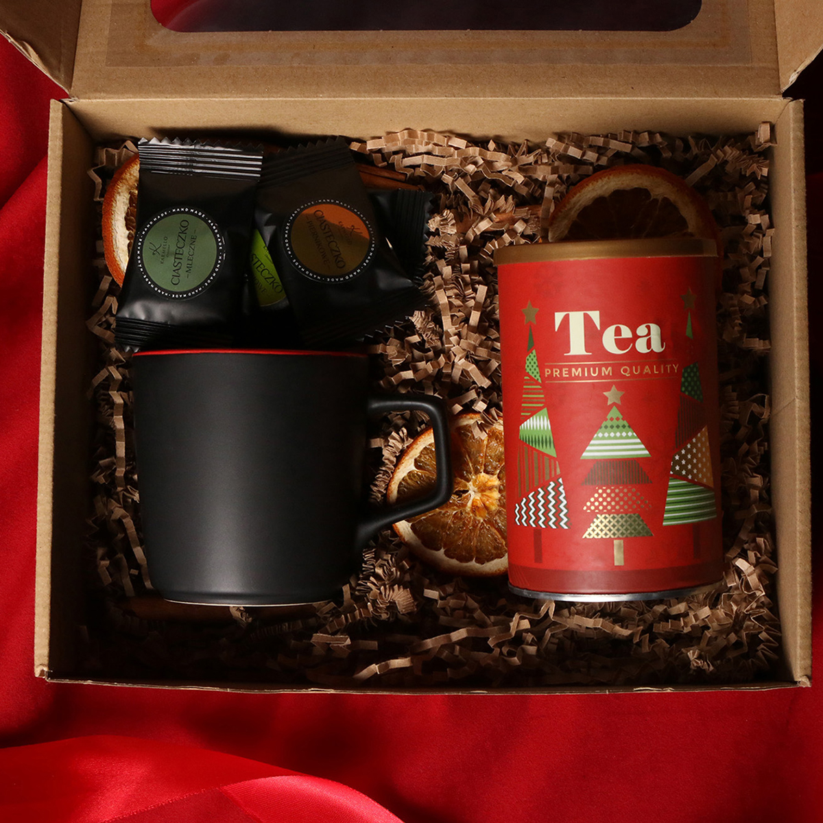 W skład zestawu wchodzą: kubek Barrel Supreme czarno-czwrwony / czarny-reflex blue / czarny-czarny z możliwością zdobienia, zielona herbata Sencha z wiśniami, płatkami róży zapakowana w tubę z motywem zimowym, 8 sztuk czekoladek / ciasteczek - mix smaków. Całość w stylowym opakowaniu z tektury eco z okienkiem. Opcje dodatkowej customizacji: nadruk na kubku, bilecik z logo firmy, wstążka lub obwoluta z motywem zimowym wzbogacona złoceniem.